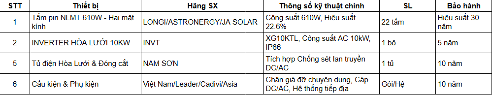 Để đạt được công suất 13.4kWp và hiệu suất ổn định, hệ thống được cấu thành từ các thiết bị chất lượng cao: