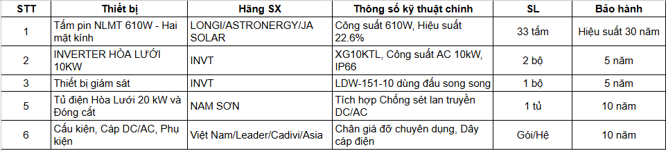 • 33 tấm pin 610w hai mặt kính (Bifacial): Lựa chọn từ các thương hiệu hàng đầu như LONGI, ASTRONERGY, hoặc JA SOLAR. Pin hai mặt kính có hiệu suất modum cao (22.6%) và được bảo hành hiệu suất lên đến 30 năm.