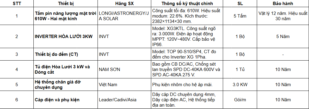 - Điều kiện lắp đặt: Giá trọn gói áp dụng cho hệ thống lắp đặt áp mái tôn.