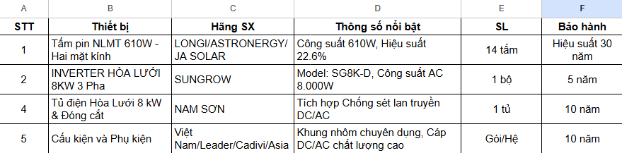• Tấm pin 610w hai mặt kính (14 tấm): Lựa chọn hàng đầu từ LONGI, ASTRONERGY, JA SOLAR. Loại pin hai mặt kính hiện đại giúp tối ưu hóa hiệu suất (22.6%) và được bảo hành hiệu suất lên tới 30 năm.
