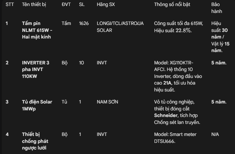 Nam Sơn Solar luôn đảm bảo cung cấp các thiết bị chính hãng, công nghệ cao, đạt chuẩn quốc tế, là nền tảng cho hệ thống 1MWp hoạt động ổn định và bền bỉ: