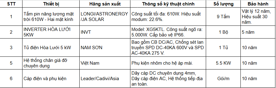 - Inverter hòa lưới INVT 5kW (XG5KTL): "Bộ não" của hệ thống, chuyển đổi điện DC thành điện AC 1 pha, công suất 5.000W. Thiết bị có cấp bảo vệ IP66 (chống bụi hoàn toàn, chống nước áp lực cao) và được bảo hành 5 năm.