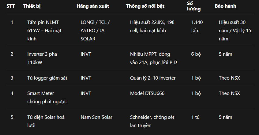 - Sử dụng Tấm pin năng lượng mặt trời 615W - Hai mặt kính từ các thương hiệu hàng đầu như LONGI, TCL, JA SOLAR, bảo hành hiệu suất lên đến 30 năm.