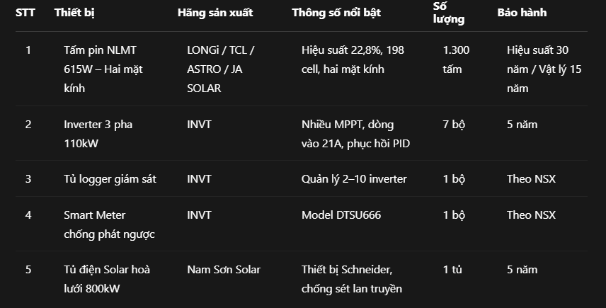 Chúng tôi tự hào giới thiệu bảng cấu hình chi tiết các thiết bị chất lượng cao được sử dụng trong hệ thống 800kWp này: