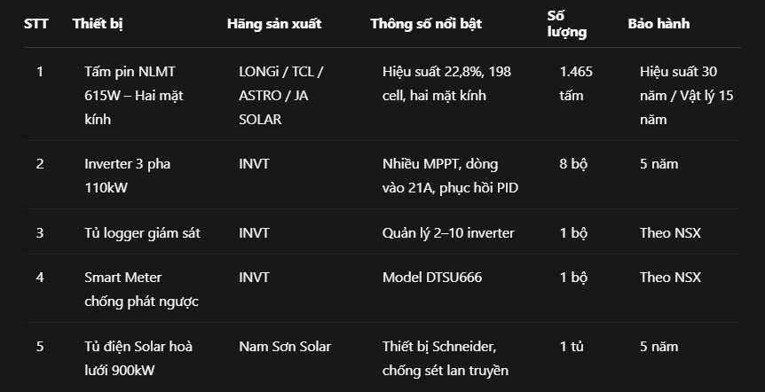 Hệ thống 900kWp sử dụng các thiết bị có hiệu suất cao và độ tin cậy đã được kiểm chứng trên thị trường quốc tế: