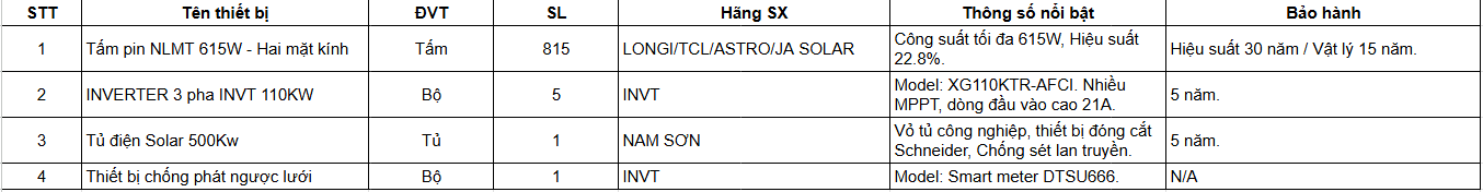 Hệ thống 500kWp của Nam Sơn Solar được trang bị các thành phần công nghệ tiên tiến nhất để đảm bảo sản lượng điện tối ưu: